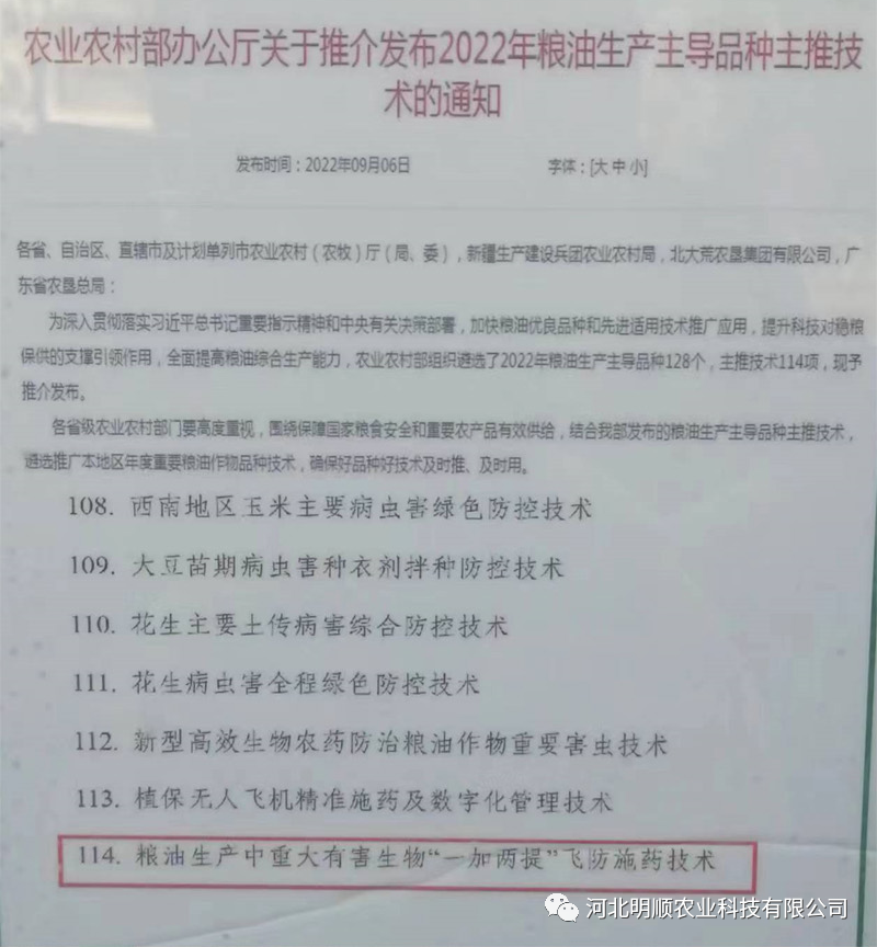 2022年申报的《粮油生产中重大有害生物“一加两提”飞防施药技术》入选农业农村部主推技术。(一加两提即:添加飞防助剂,提高农药利用率和提高防治效果)